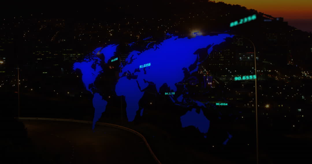 Blue world map with floating white numbers on black background conveys global business and data analytics themes. Suitable for presentations about technology, global markets, financial analysis, or digital interface design projects.