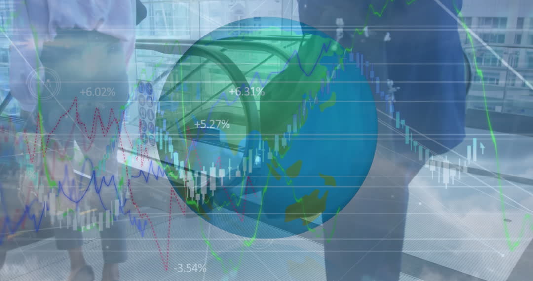 The digital interface and globe overlay convey a sense of global connectivity and modern business analytics. Useful for presentations and content focusing on financial markets, international business strategies, or technology-driven economic analysis. Can also enhance visuals for reports about market research and innovative business methods.