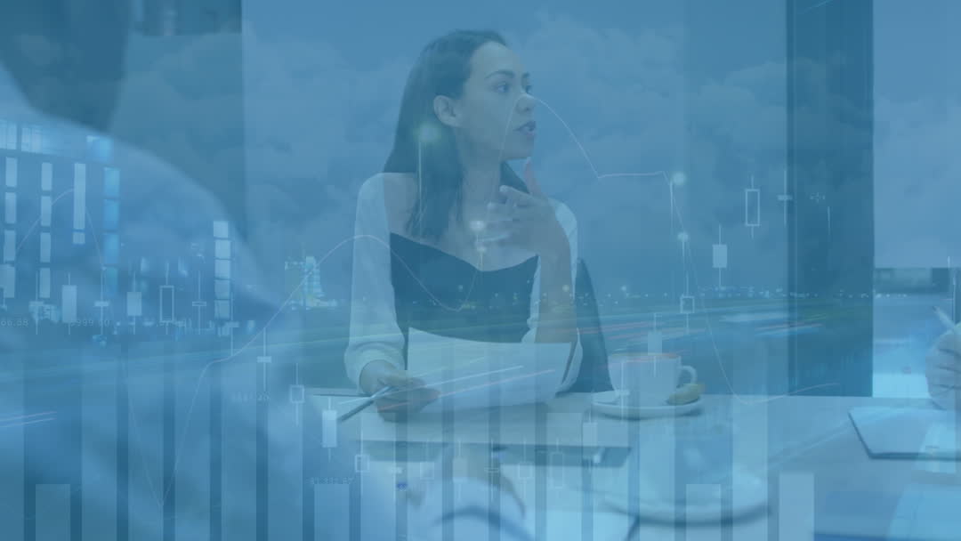 Dynamic video shows diverse team collaborating in an office, reflecting integrated data processing against backdrop of cityscape. Useful for promoting global business strategies, technology integration in workplaces, and modern financial services. Ideal for webpages highlighting team collaboration, business innovation, or data-driven solutions.