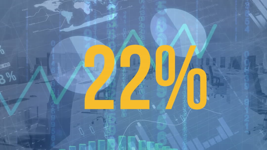 Abstract conceptual graphic of worldwide business data. Central focus is bright yellow 22% overlaid with business analytics and global map background. Useful for corporate presentations, business forecasting, financial reports, and digital marketing materials showcasing growth or strategic insights.