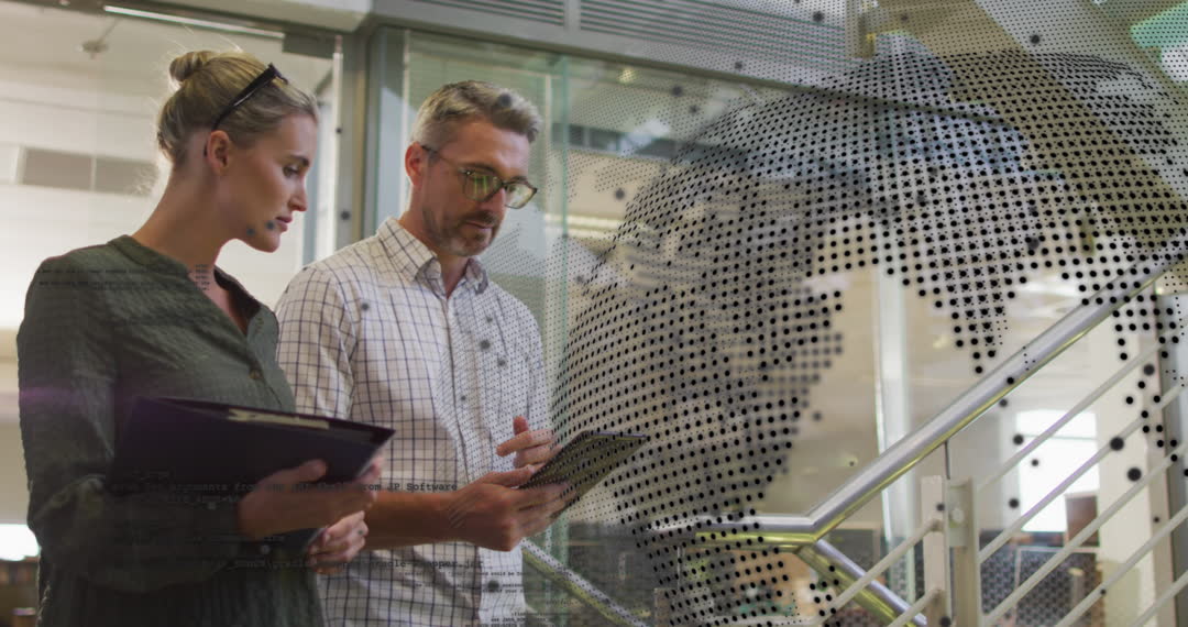 Professional man and woman engaging in business discussion, highlighted by dynamic digital globe. Suitable for themes related to global business operations, technological innovation, or teamwork concepts. Ideal for presentations or marketing related to business and tech solutions.