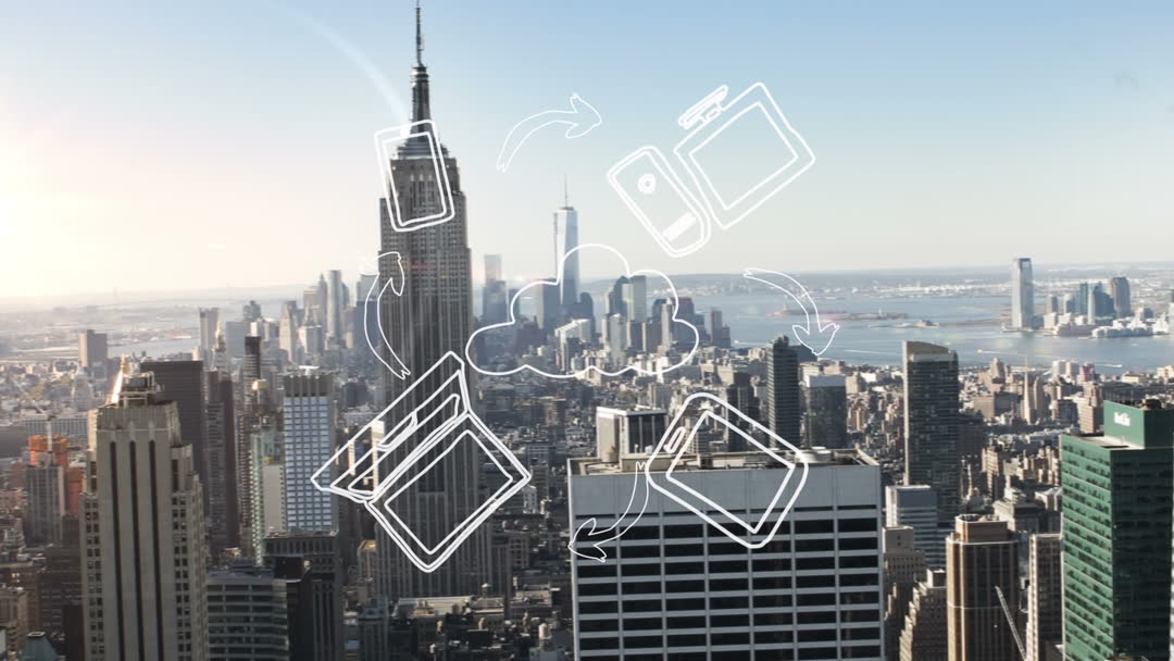 Illustration depicts various business icons such as cloud, arrows, and devices over a bustling cityscape. This blend of digital videory with an urban background represents modern business, technological advances, and global connectivity. Useful for presentations on urban development, corporate growth, or tech innovations.