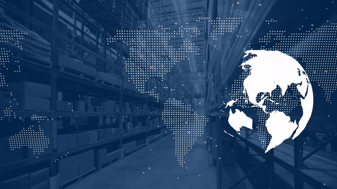 Illustrates modern global business operations merging with technology in a warehouse environment. Ideal for content related to supply chain management, logistics technology, or global business strategy articles.