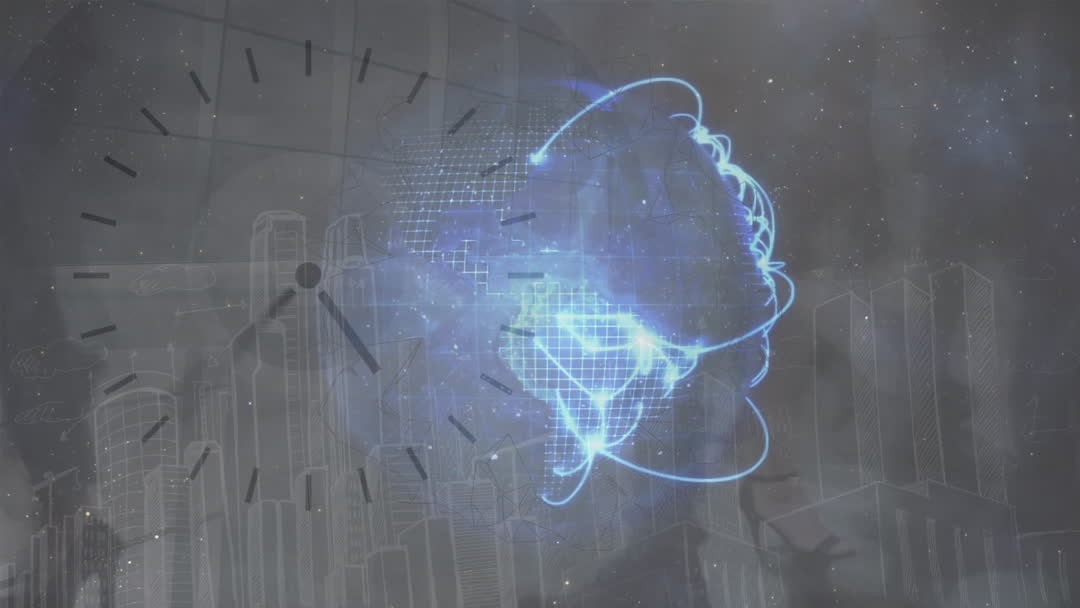 Depicting concepts of time and global connectivity, this abstract animation features a digital globe intertwined with a clock, representing the intersection of international business and modern technology. Ideal for usage in presentations or articles focused on globalization, digital transformation, technology planning, or financial industry advancements.