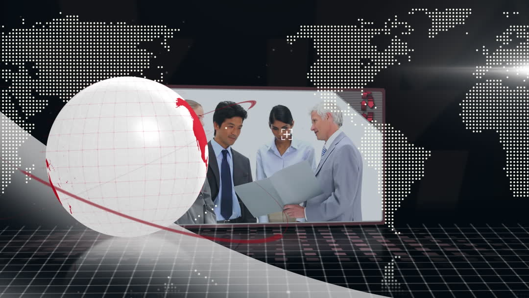 Animation showcasing a business meeting among professionals with a globe and world map cor. Use for illustrations of global business themes, digital innovation, and technology-driven environments in presentations or websites.