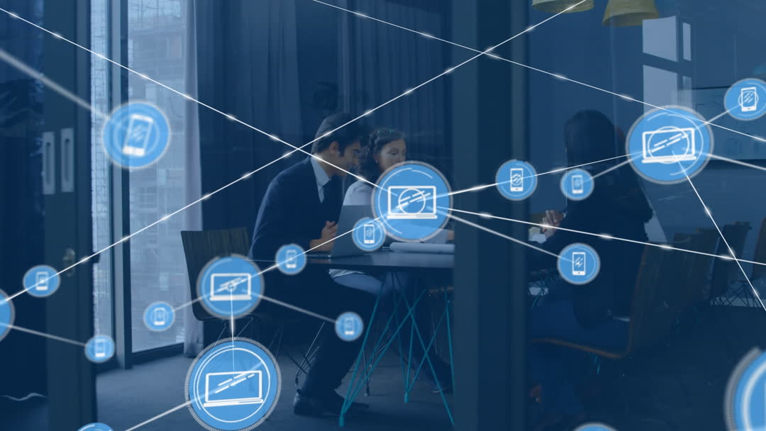 Business professionals in a modern office setting interconnected by digital network icons, representing global communication and technology integration. Ideal for use in articles about business networking, technology in workplaces, global communication strategies, and innovative collaboration techniques.