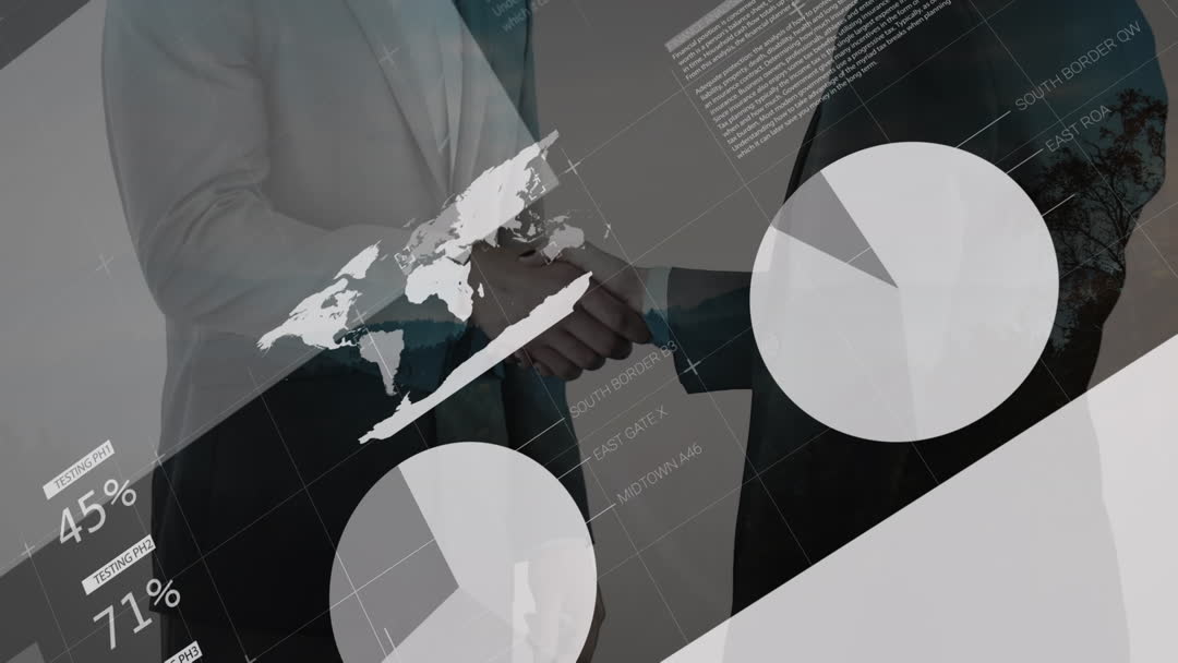 Visual shows business partnership in action with an overlay of financial data and global map elements, symbolizing international collaboration and data-driven decisions. Suitable for illustrating concepts of global business, finance analysis, partnership agreements or corporate events in digital campaigns or presentations.