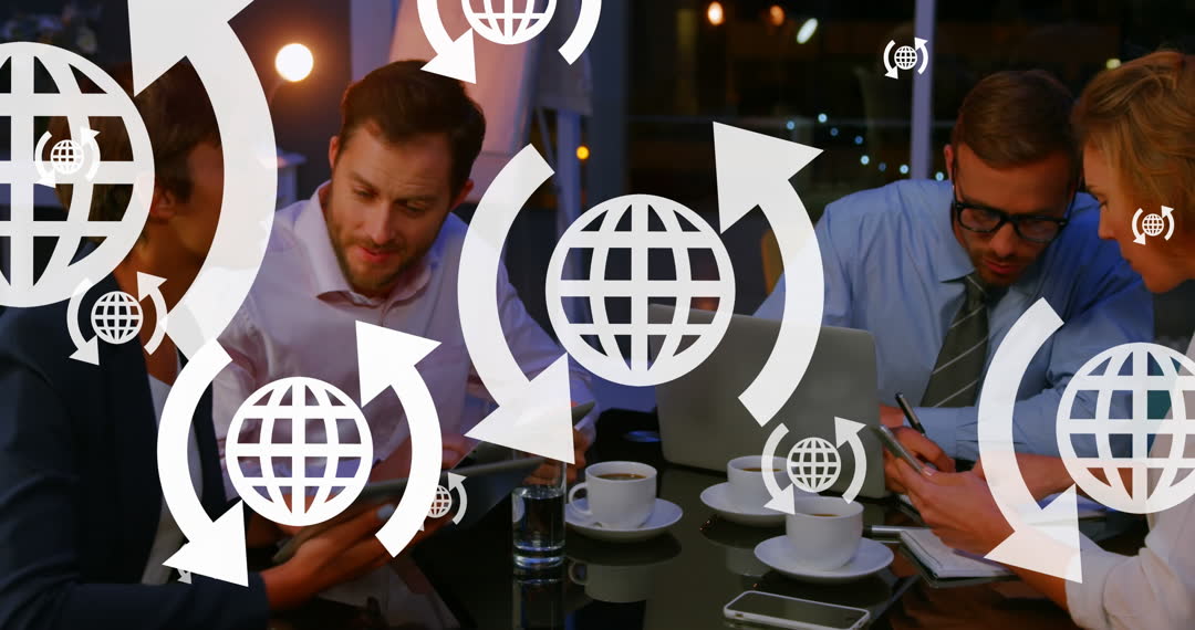 Business professionals engage in a strategy discussion at a cafe, highlighted with digital animations of arrows and globes symbolizing globalization and teamwork. This video can be used for materials related to business planning, global communication, collaboration, or educational content on globalization and technology in the workplace.