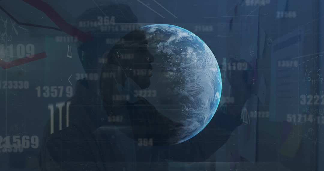 Conceptual depiction of a person collaborating over strategies in an office environment, with a global theme highlighted by the Earth's planetary video juxtaposed with digital numbers. This represents modern technology's role in international business strategies, pulling together abstract ideas of data analysis, connectivity, and global markets. Useful for websites, corporate presentations and content focusing on global economy insights and technological advances in business sectors.