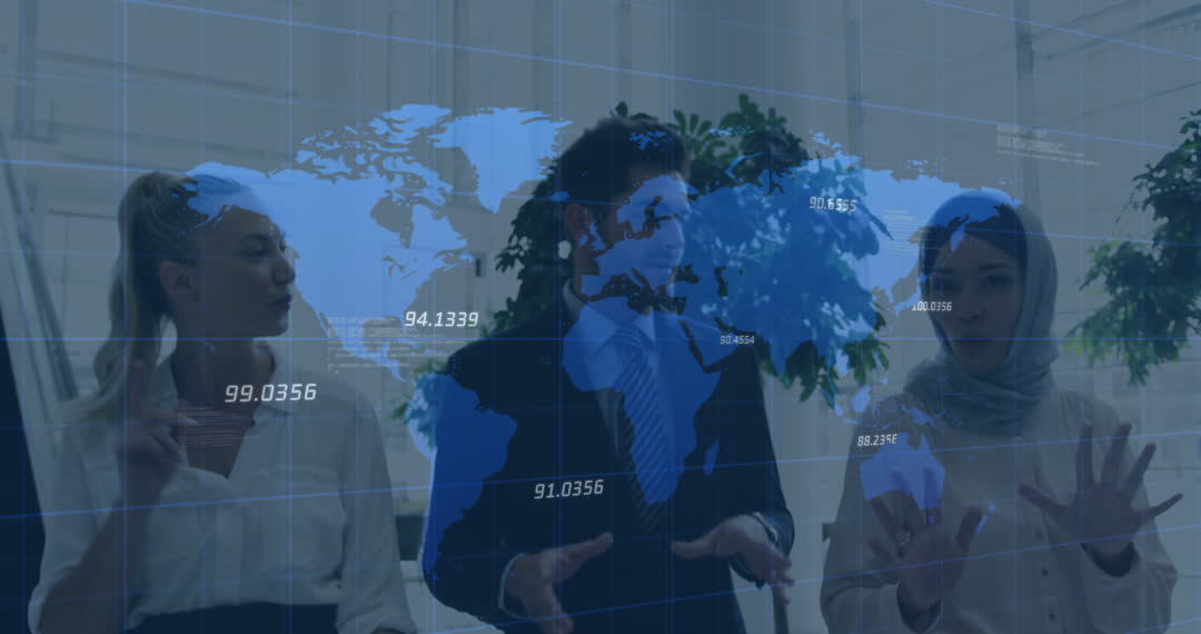 Team of diverse business professionals engaging in discussions and analyzing data through a digital interface. Suitable for illustrating themes related to global business strategies, diversity in the workplace, advanced digital technology in business settings, and international collaborations.