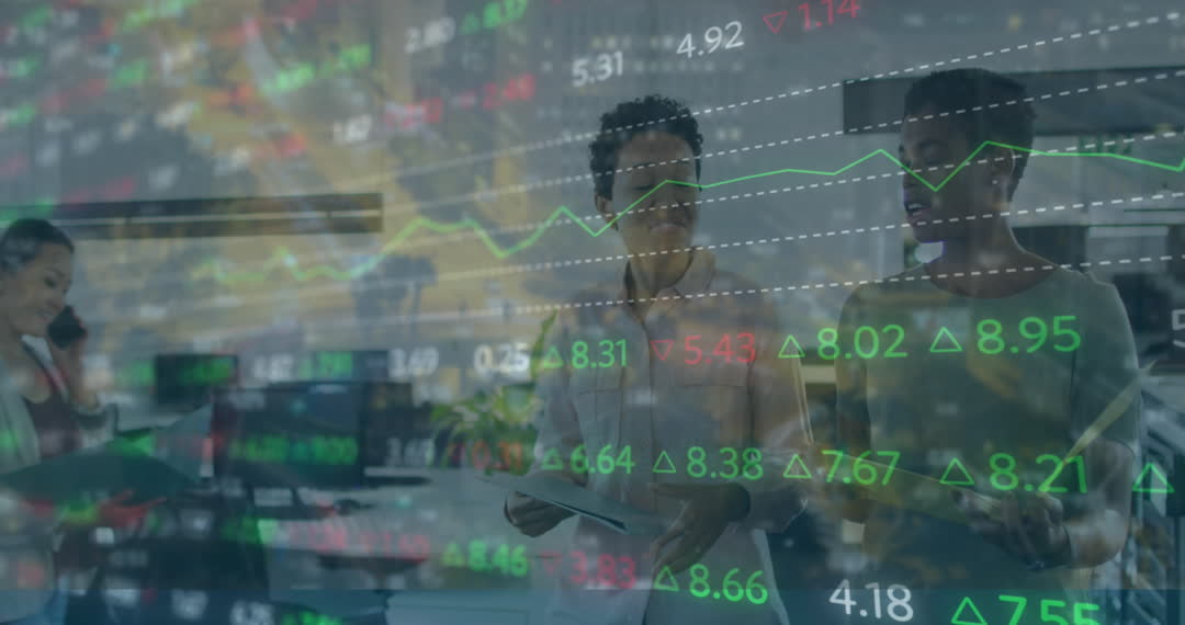 Business professionals collaborate in a modern office with digital financial data overlays. Suitable for illustrating themes of global finance, teamwork, data analysis, digital business strategies, and diverse workplace environments.