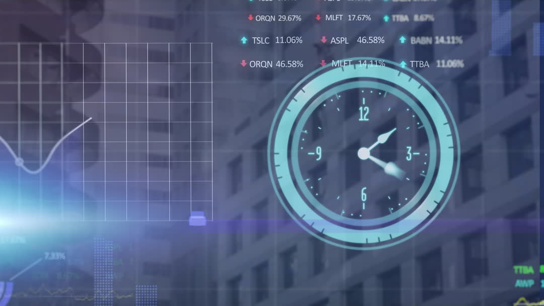 Abstract representation of global business technology featuring an animated clock, stock market data, and digital design elements. Background suggests corporate financial themes, potentially useful for content related to global economics, stock market analysis, financial technology advancements, or time-sensitive economic strategies.