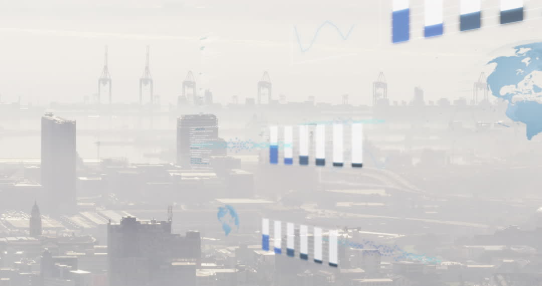 Presenting an intricate blend of digital graphics and urban vistas, this visualization depicts layers of business analytics and technological concepts superimposed on a fog-covered cityscape. The animated elements show graphs, globes, coding symbols, and waves, symbolizing connections between urban living and global commerce. This visual can be effectively used for projects focusing on international business communication, tech-driven economies, smart city solutions, or modern urban planning initiatives, seamlessly integrating elements of automation, innovation, and underlying technological infrastructure.