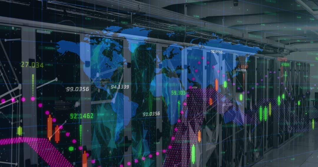Visualizing global data analytics and business technology, this illustration features overlays of economic graphs and charts along with a conceptual background of technological servers. Ideal for use in presentations, technology blogs, and articles focusing on global business trends, data processing, and future technology solutions.