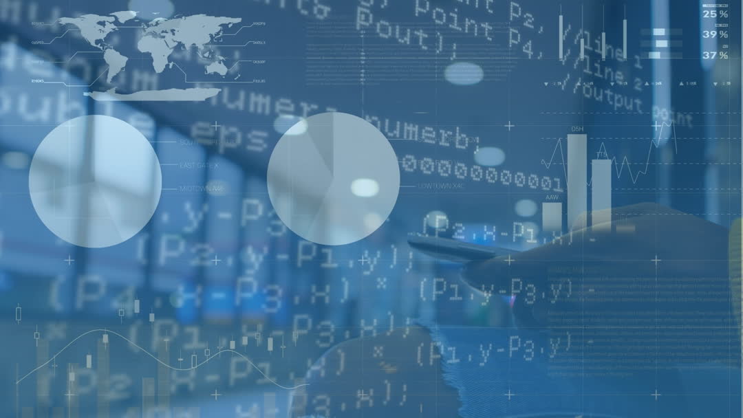 A representation of advanced global business technology with an overlay of financial graphs and datasets against hands holding a smartphone. Visual elements symbolize the intersection of digital data and financial growth. Useful for illustrating technology's impact on modern business, digital transformation in the finance sector, or advancements in global economy themes.