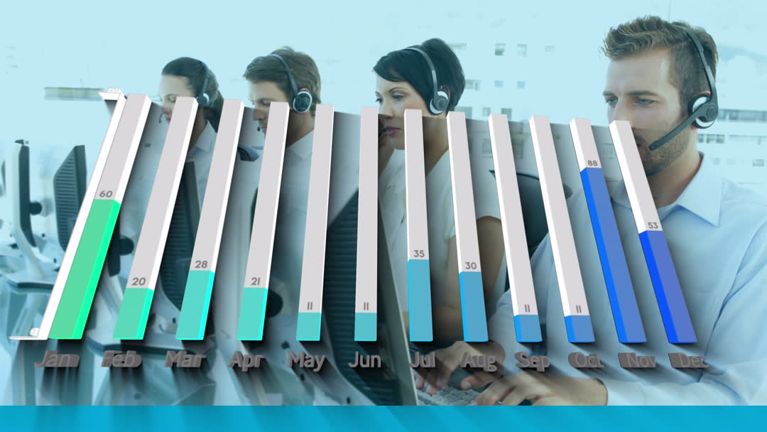 Foreground showcases diverse team of business people using headsets, representing workplace communication. Superimposed bar graphs illustrate monthly performance data. Ideal for use in articles about customer service efficiency, sales analysis reports, or presentations focused on KPI tracking in business environments.