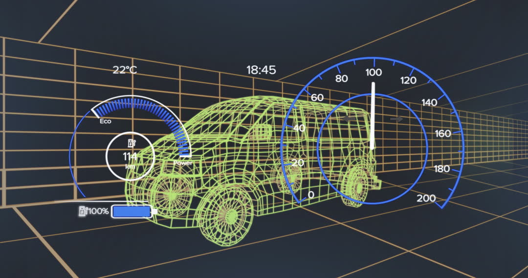 Graphic illustrating intersection of technology and automotive industry, with 3D car design and real-time data overlay. Speedometer and digital metrics reflect modern car functions, useful for presentations on automotive engineering, technology integration, and industry trends.