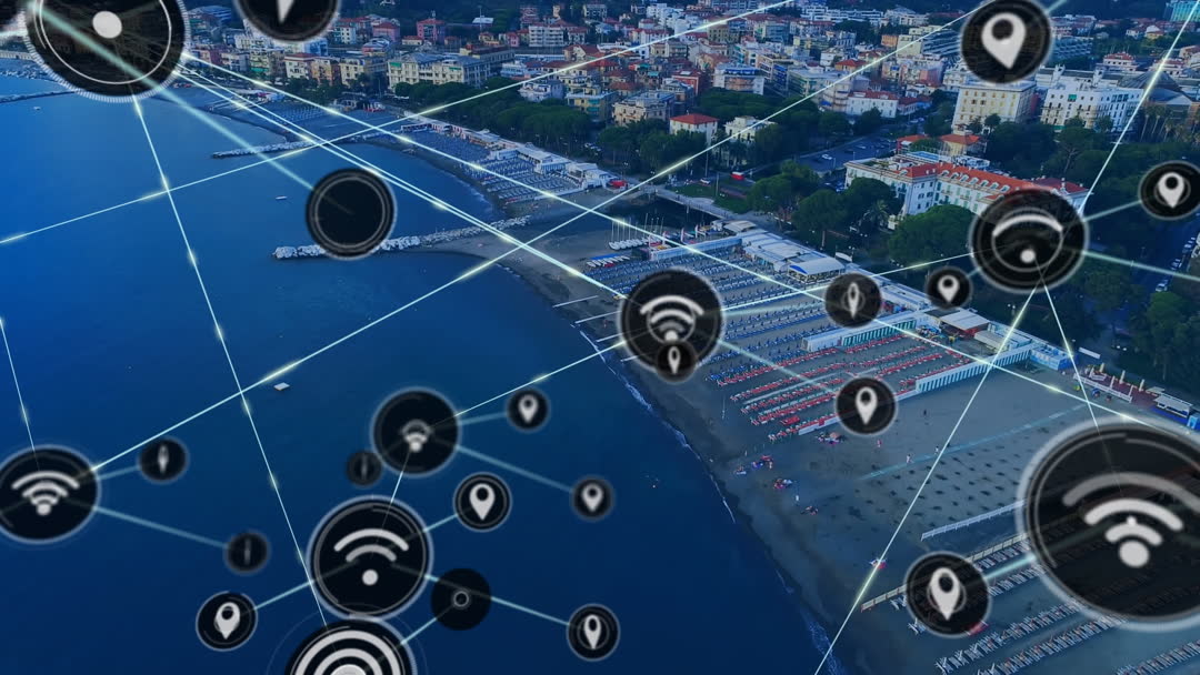 A digital overlay of network icons like WiFi signals and location markers shows an interconnected web above an urban landscape by the coast. Useful for illustrating modern connectivity, business technology, or the concept of a smart city. Ideal for presentations, articles, or educational material about digital linked infrastructures.