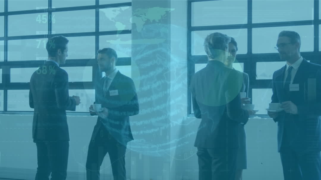 This visualization depicts diverse business professionals engaging in casual discussions during a coffee break within a modern, airy office environment. The digital animation of a globe symbolizes interconnectedness and global collaboration, suitable for illustrating corporate teamwork, networking events, or emphasizing the theme of globalization in a business context.