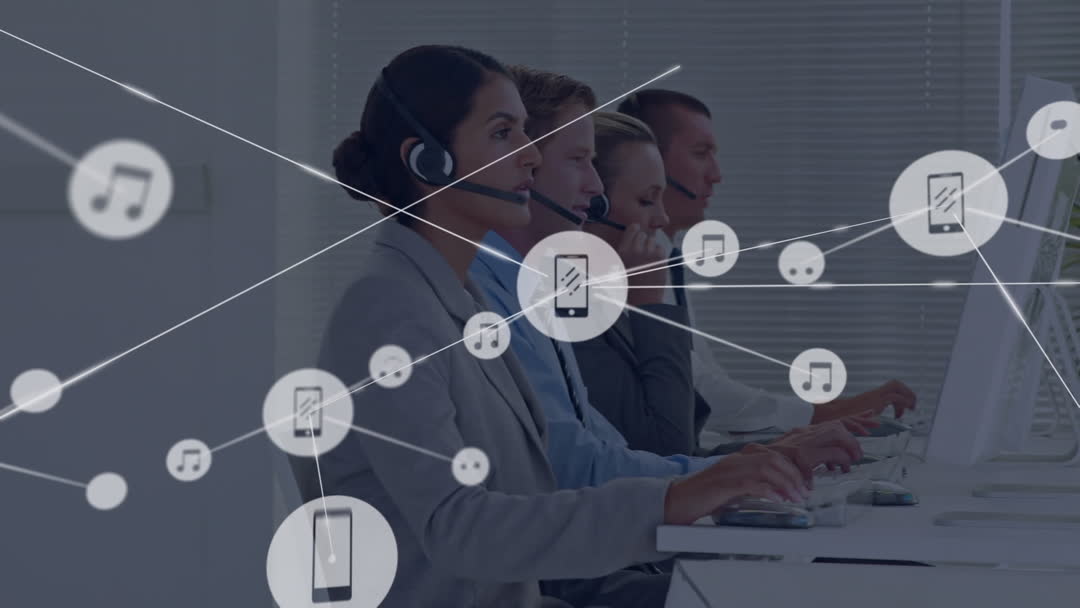 Dynamic video showcasing a network of digital icons flowing above a diverse team working in a modern office setting. Workers appear focused, using headsets and computers. Ideal for illustrating articles on global communication, modern teamwork, customer support solutions, technological integration in business, or networking strategies.