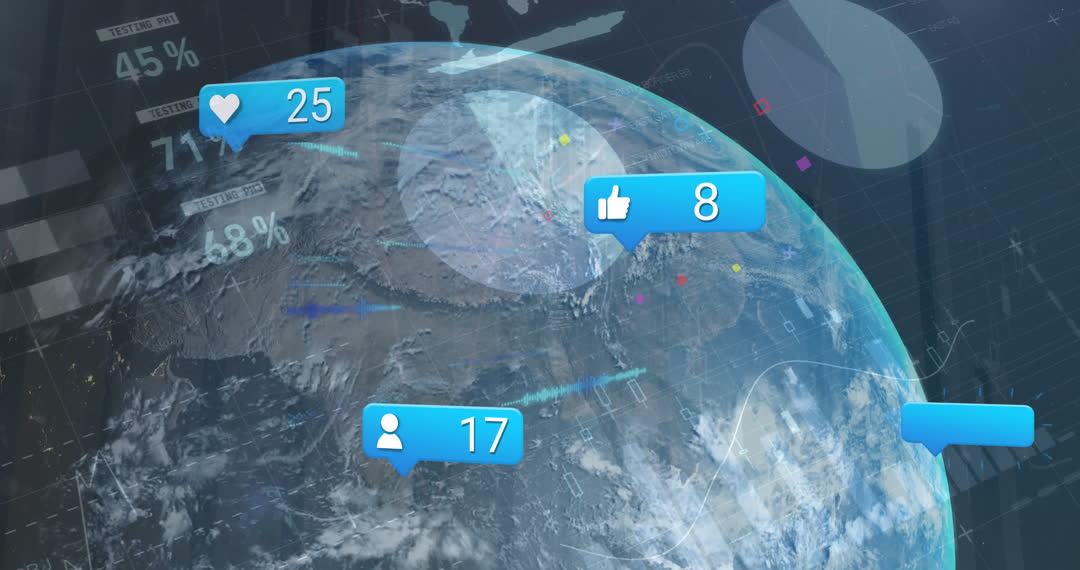 Visualization of global communications and social media interactions represented by a globe with various data and icon overlays. Suitable for technology, telecommunications, data analytics interpretation, social networking, and global communication themes. Can be used for illustrating online connectivity, impact of social media, and communication advancements.