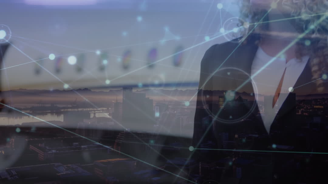 Depicts a futuristic concept with overlay of digital connections symbolizing global networking and data processing. Ideal for illustrating modern technology themes, network security, or international business strategies. Useful for presentations highlighting global reach and technology integration.