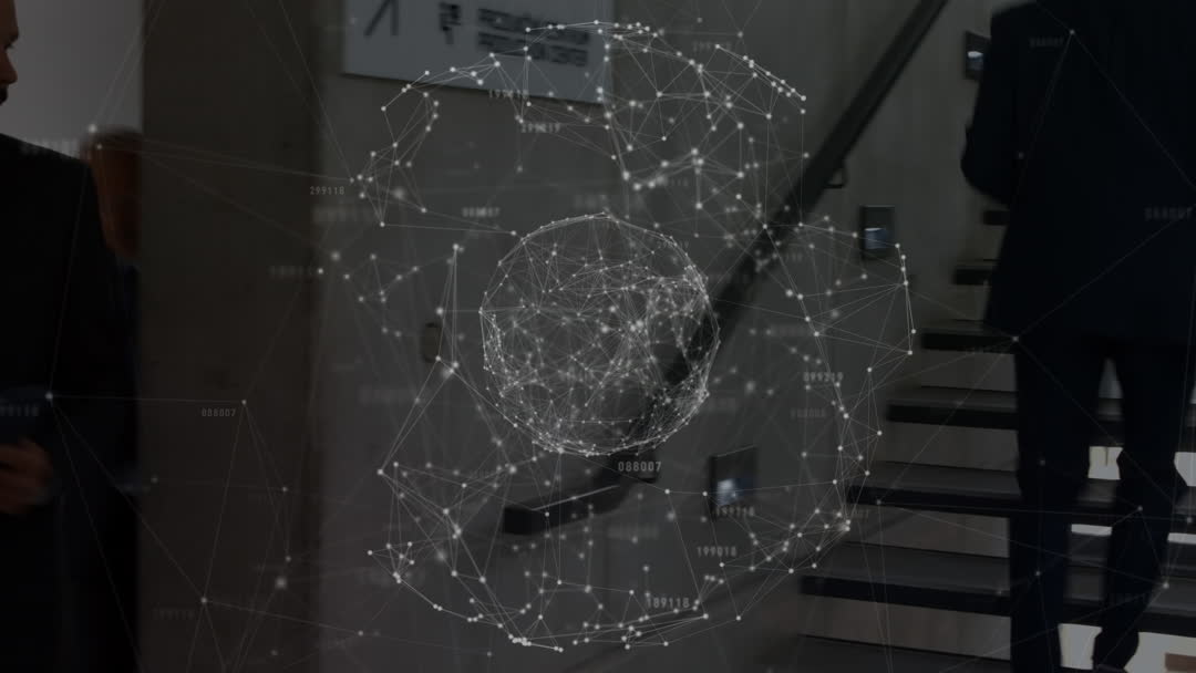 This video depicts a dynamic digital representation of a globe with connections, transposed over two businessmen walking upstairs. Ideal for illustrating concepts related to global networking, data analysis, technological advancements, and corporate innovation. Perfect for use in business presentations, technology blogs, and company reports focused on data connectivity and international business growth.