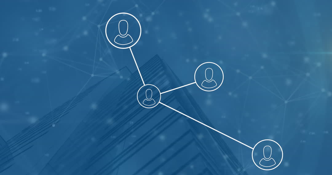 The illustration shows a network with interconnected nodes depicted over a blurred building background, symbolizing global communication and data processing. Ideal for highlighting features of network security, internet of things (IoT) technologies, or illustrating articles focused on technological advancements and close online communication. This could be used in digital marketing materials, cybersecurity workshops, or educational content on global connectivity.