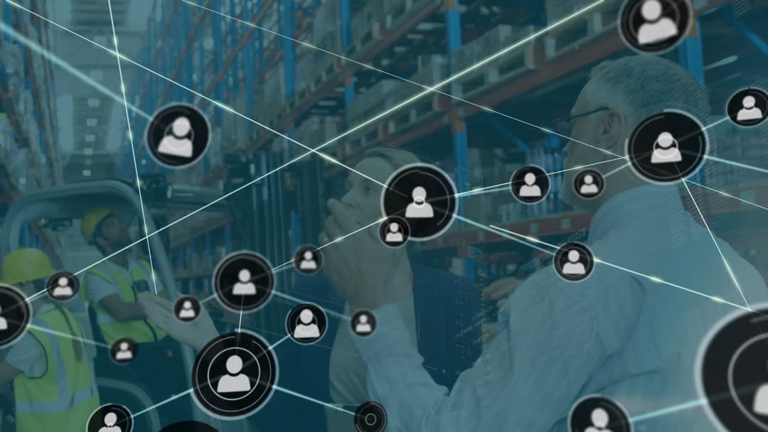 People in a warehouse working environment interact with network connection symbols, representing global logistics solutions. This visual is ideal for illustrating concepts related to supply chain management, shipping networks, or the digital transformation of logistics operations. Useful for businesses showcasing services in global trade, e-commerce platforms, or technological advancements in warehouse management.