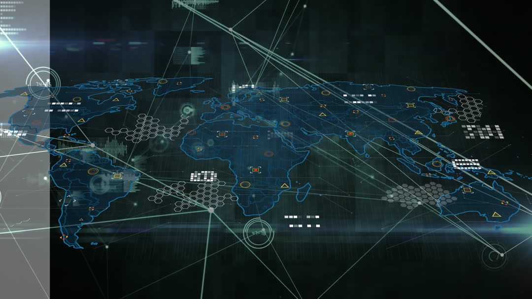 Illustrating digital connectivity, this video shows a world map with data connections and network overlays on a dark background. Ideal for use in presentations about global networking, cybersecurity concepts, or technology innovations, it emphasizes the theme of worldwide digital infrastructure.