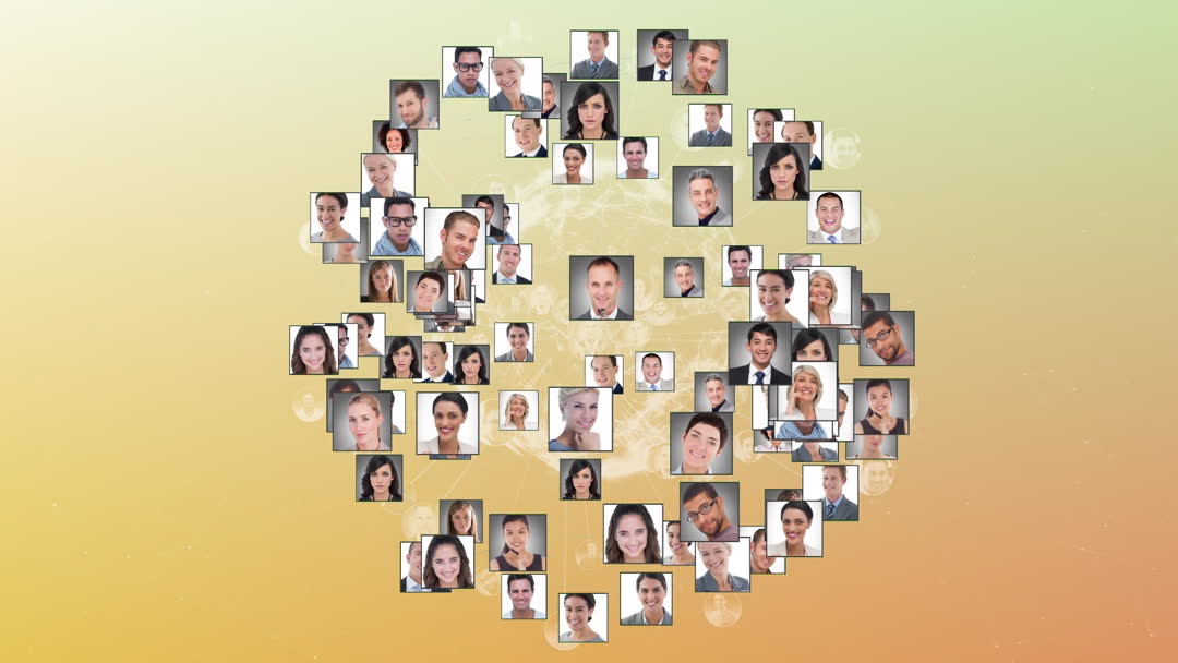 Visual depicting digital networking with user photos forming connections on globe simulation signifies global interaction and connectivity. This video is ideal for use in articles, presentations, or designs focused on networking technology, global communication platforms, social media connectivity, and technical integration.