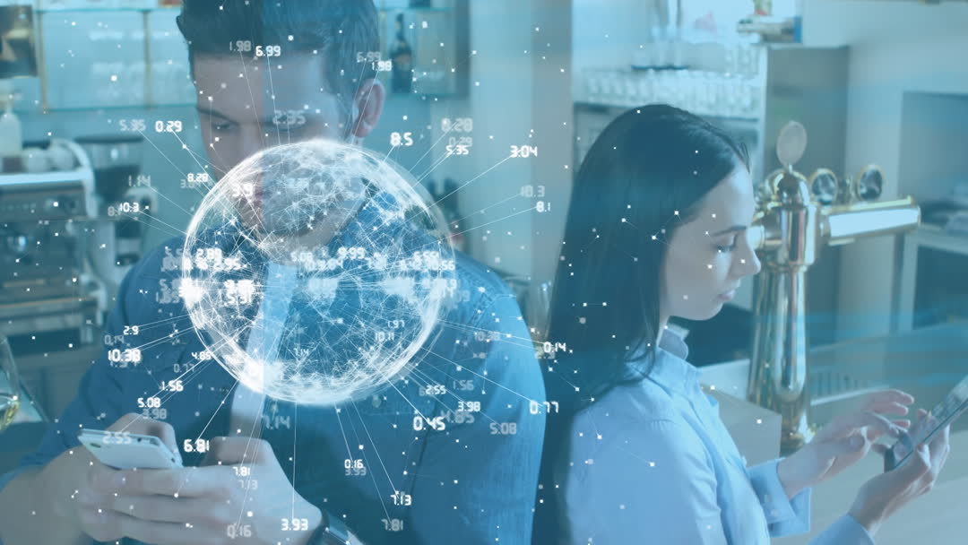Depiction of diverse business people using smartphones with an animated data and globe overlay, symbolizing global connectivity and digital advancement. Illustrates the impact of technology on communication and data exchange in a modern business environment. Suitable for use in technology, global business, or digital communication contexts in marketing materials, presentations, or articles related to digital transformation.
