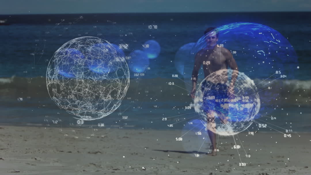 Visualization shows futuristic holographic globes with digital data overlaid on beach scenery, perfect for illustrating concepts in global data analysis, technological advancements, or connectivity. This can be used in tech blogs, educational presentations, or innovation research articles to demonstrate the intersection of technology and nature.
