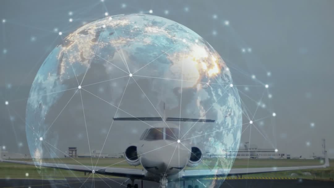 This visual showcases a jet aircraft taxiing on a runway with a digital globe overlay, symbolizing worldwide connectivity in the aeronautics sector. It highlights the integration of cutting-edge technology in transportation and conveys themes of globalization and innovation. This video can be used in presentations, advertisements, or educational materials focusing on advancements in transportation and digital connectivity.