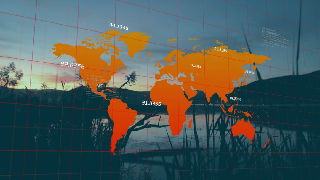 Animation shows numbers floating over a world map against a scenic backdrop of mountains and a lake. Indicates global connectivity and data flow. Suitable for illustrating concepts in global business, technology networking, and digital marketing. Ideal for use in presentations, marketing materials, and educational content on technology's global impact.