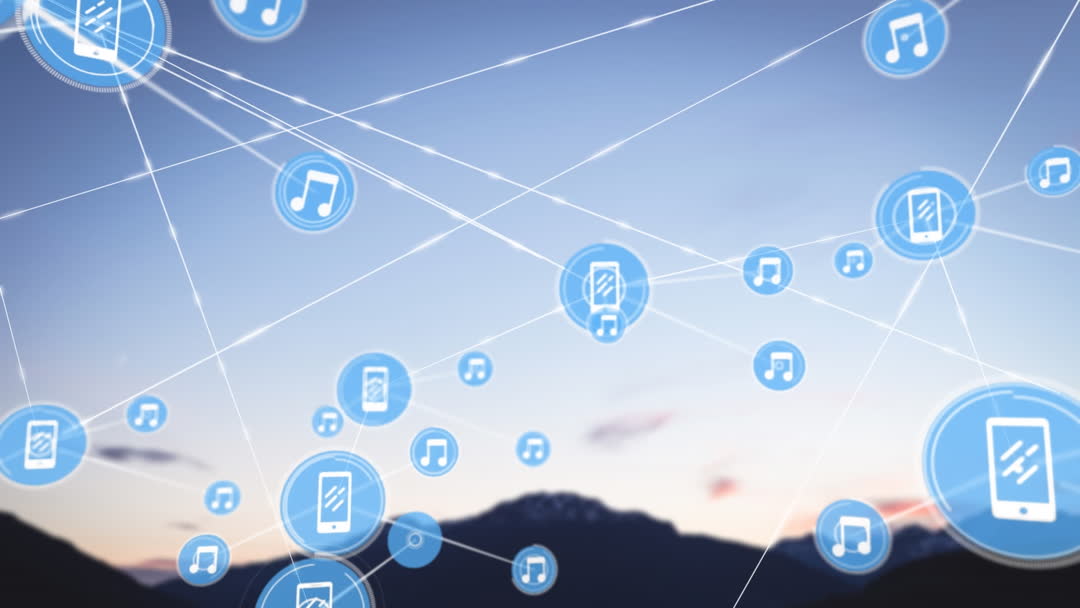 Visual representation of global connectivity with interconnected icons for music and communication overlaying a mountainous landscape. Ideal for themes related to internet evolution, digital transformations, and multimedia integration. Perfect for use in presentations on technology advancements and global network infrastructures.