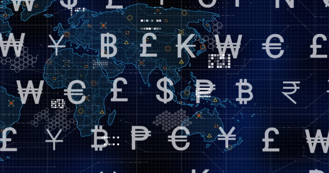 Currency symbols overlay a world map set against a blue digital background, indicating global financial connectivity and economic themes. Ideal for illustrating topics related to global economy, international trade, financial technology, and data processing in presentations, articles, or educational materials highlighting economic modules or currency manipulations in technology sectors.