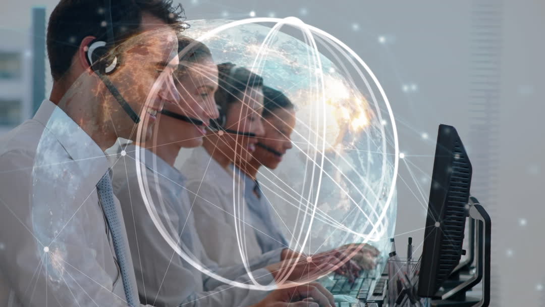 This visual illustrates a diverse team of professionals in an office environment, wearing headsets and engaging in global communication through digital networks. It is ideal for use in projects related to customer service, technical support, digital technology, or globalization. The mix of human interaction with graphic overlays of global data networks can emphasize connectivity and teamwork in the digital age.