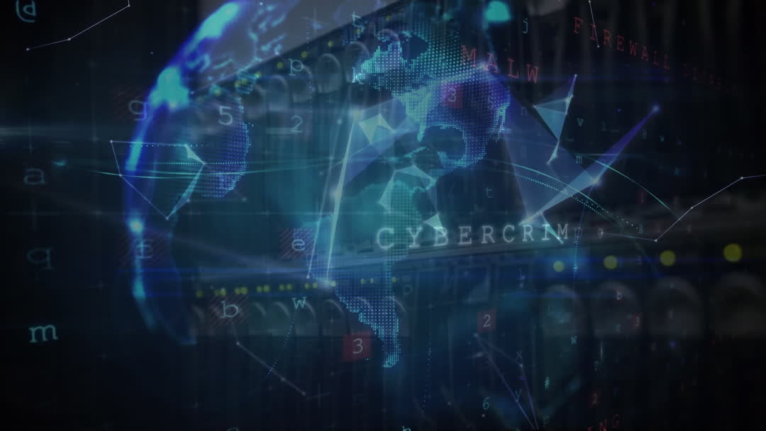 This abstract visual with a digital globe and data processing overlays represents global cybersecurity and cybercrime. It highlights concepts like digital networking, information security, and the impact of technology. Ideal for use in presentations regarding cybersecurity awareness, tech conferences, or website visuals related to data protection companies.