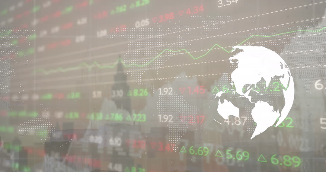 Conceptual graphics displaying various data charts and global connectivity overlaid on a city background. Ideal for illustrating themes of international commerce, market analytics, or digital finance strategies.