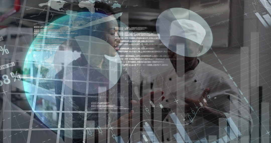 Creative portrayal of a business and culinary fusion showing a blend of data analysis elements and professionals, emphasizing global markets and technology. Ideal for use in materials related to business analytics in the food industry, digital marketing for culinary services, or innovation in global cooking operations.