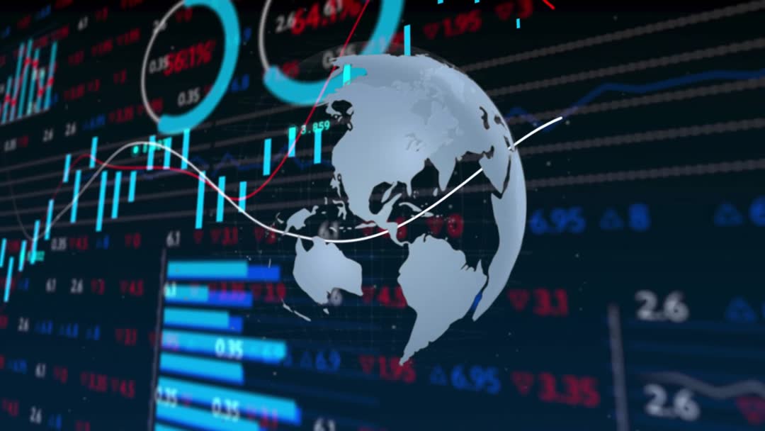 This visual features a 3D rotating globe surrounded by dynamic graphs and charts showcasing data analytics. The composition highlights technological advancements and global economic trends. Ideal for presentations on global finance, technology in business analytics, or marketing campaigns emphasizing innovation in data trends analysis.
