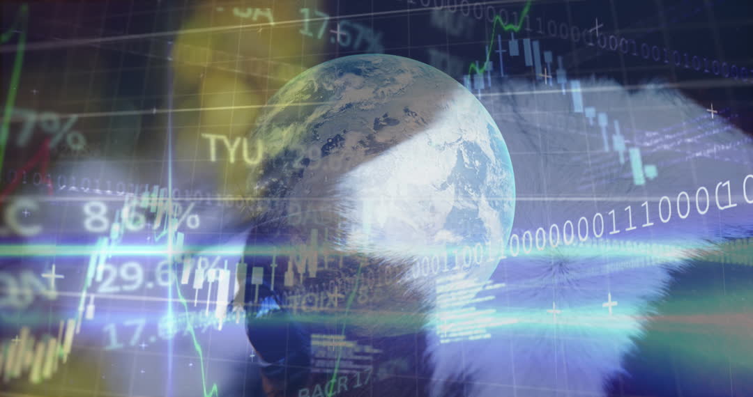 This visual represents a concept of global data analytics intertwined with technology. With the earth at the center overlayed with financial charts and binary code, this is ideal for themes related to financial forecasting, technological advancements, global communications, and big data analytics. Perfect for use in presentations, blog posts, articles about the future of technology, or marketing materials for tech companies.