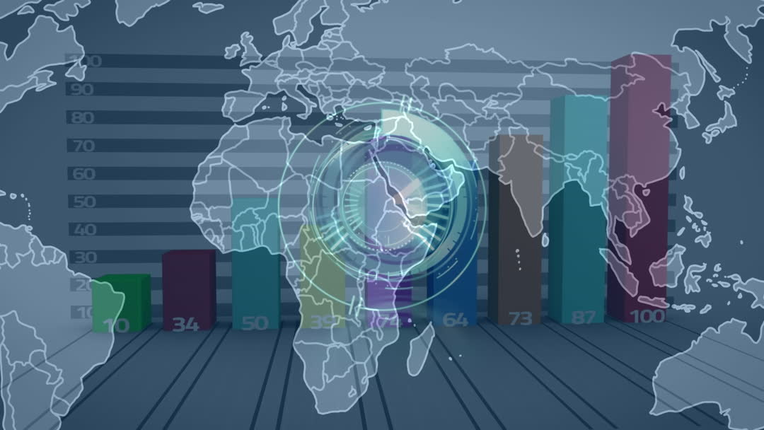 A dynamic and futuristic depiction featuring a world map overlay combined with data bars and a digital clock interface. Ideal for illustrating global technology, data analytics, and connectivity across countries. Useful for presentations, reports, or content related to digital transformation, international economics, and technological advancements.