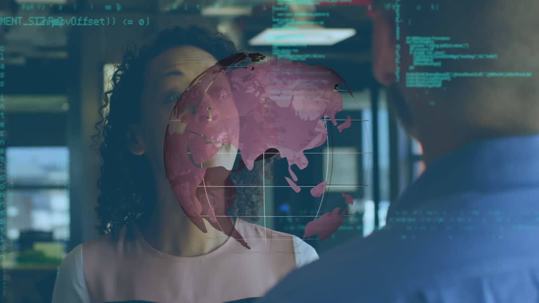 Animation with graphic of coding script merging with translucent globe over office situation, emphasizing global data flow and security. Useful for illustrating concepts in digital business integration, technology-driven communication, and security presentations.