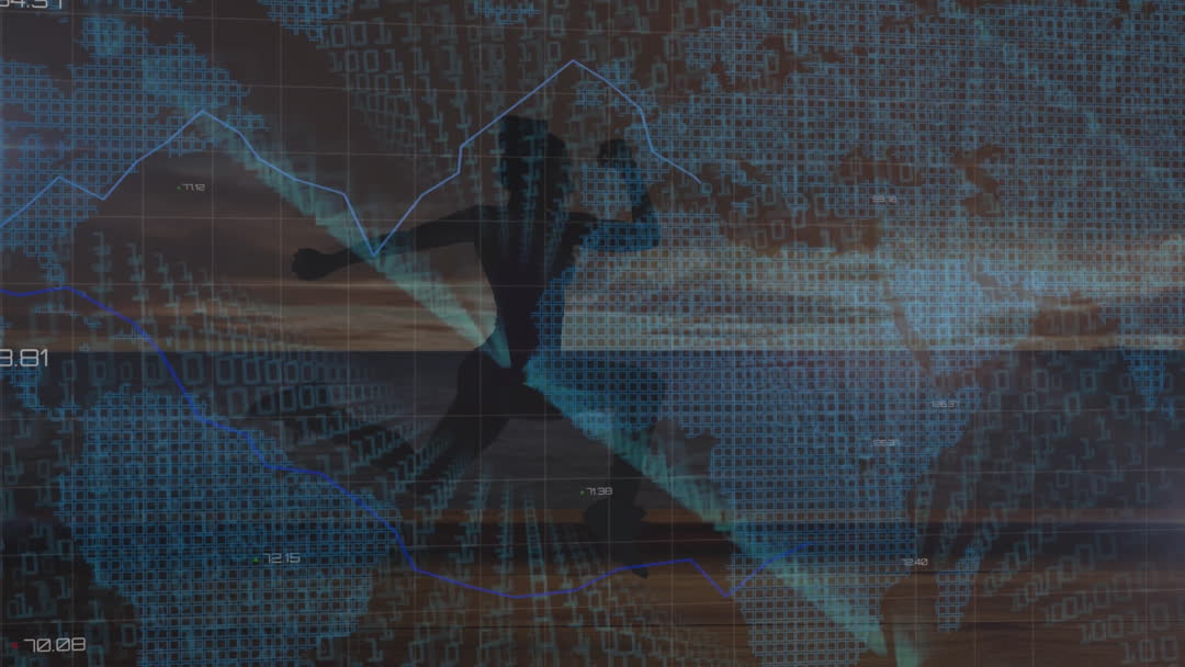 Abstract representation of global data connections showcasing integration with technology and innovation visible through a digital animation filled with a world map and data patterns. A woman running on the beach is dynamically incorporated into the scene, symbolizing the human interaction with global networks. Ideal for use in tech marketing, digital presentations, futuristic concepts, or infographics illustrating global reach and data impact.