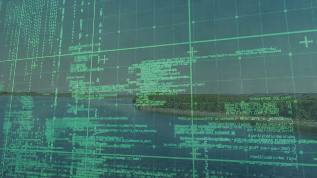 Futuristic digital codes appear overlaying a serene natural landscape, illustrating the merging of technology and earth. Useful for themes about digital transformation, technology integration in rural settings, or environmental tech solutions.