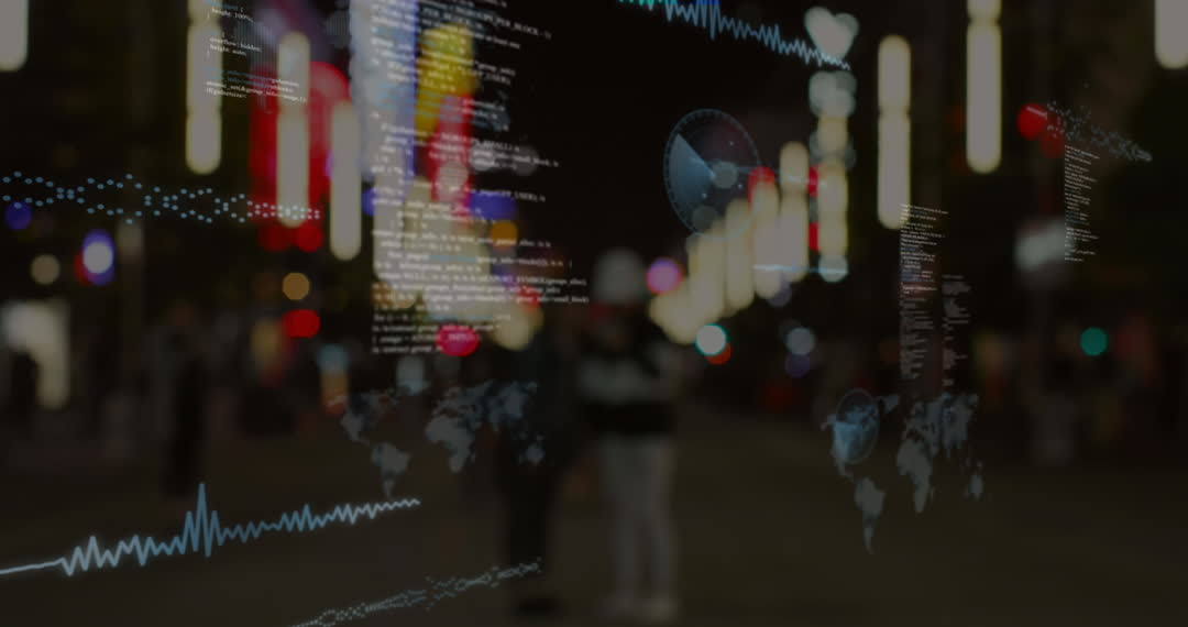 Animation depicts digital data and global connections in an urban environment. Elements of data processing and technological interface are interacting with a city backdrop, creating a sense of a futuristic digital world. Ideal for presentations on technology, digital innovation, global communication, or concepts of a smart city.