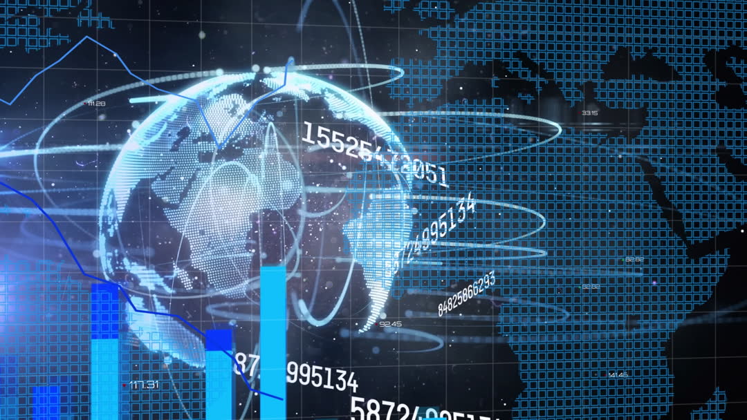 Depicts an advanced digital visualization of global data analytics intertwining with a spinning globe and a world map surrounded by fluctuating numbers and graph lines. This videory exemplifies concepts related to digital data processing, global communications in technology, and business information exchanges. Useful as visual content for marketing materials in technology-related fields, presentations on international business strategies, or educational resources illustrating big data processing.