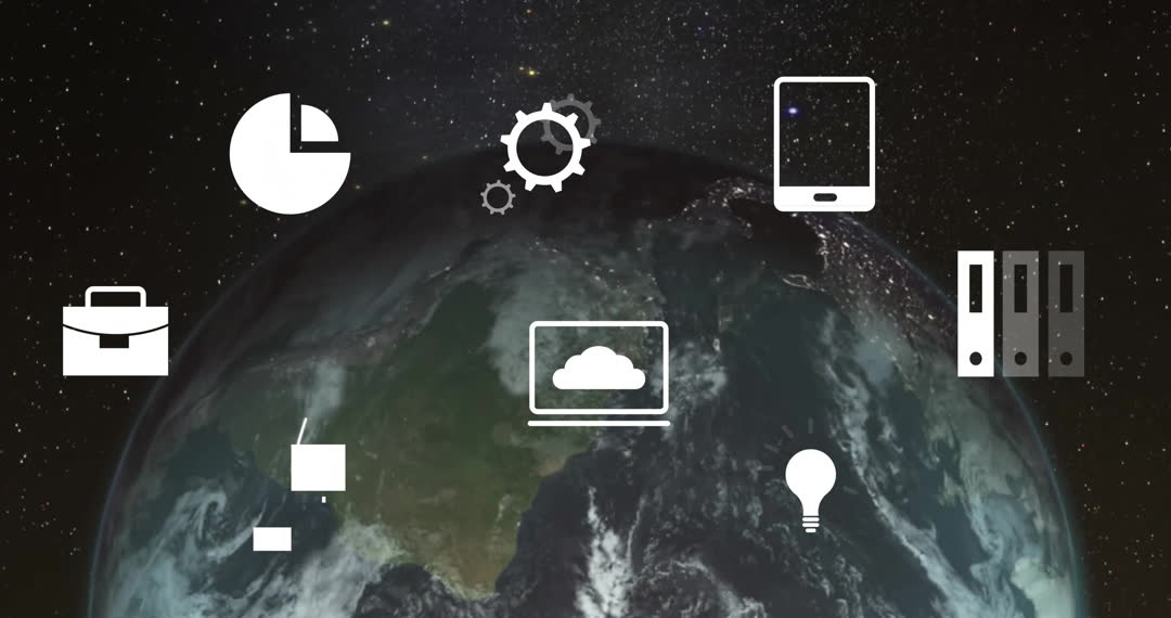 Animation featuring various business icons superimposed over planet Earth, illustrating global data processing and digital connectivity. Useful for technology presentations, discussions on global networking, and visual content for computing concepts.